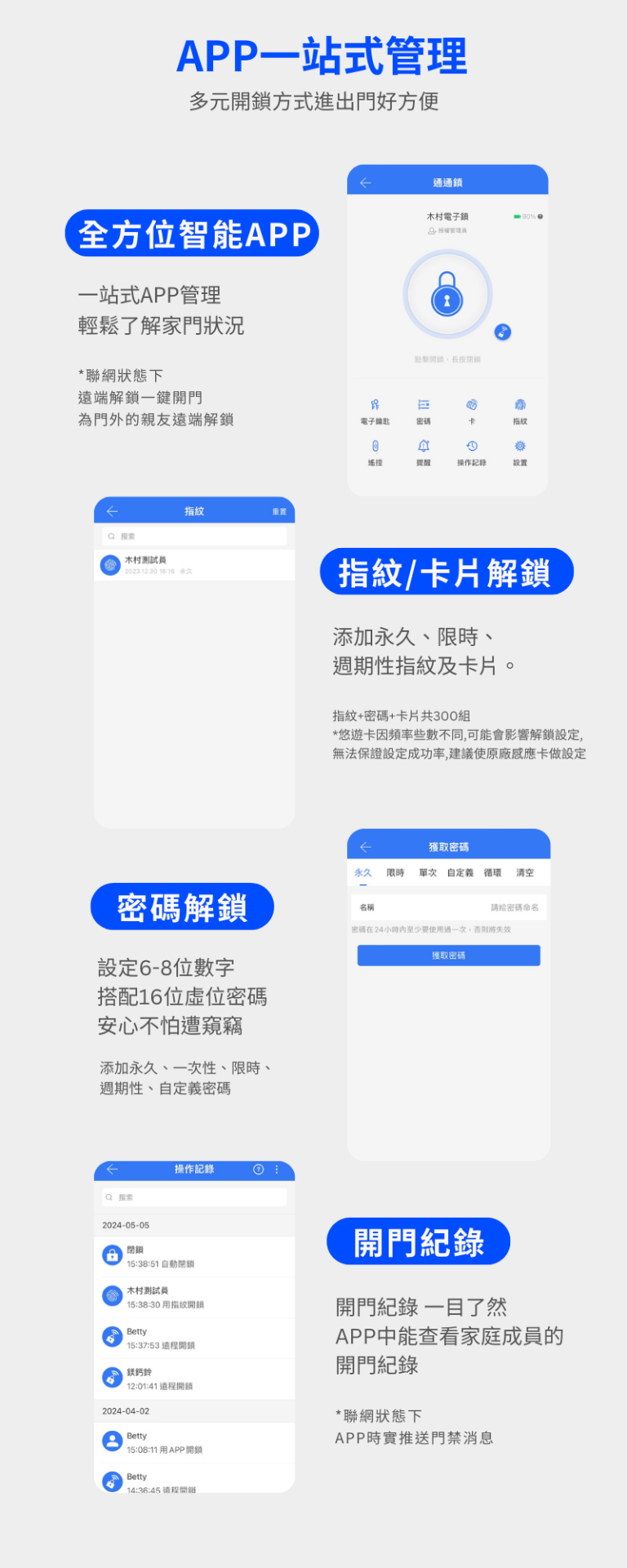 功能:指紋、密碼、卡片、緊急鑰匙、APP開鎖、遠端開鎖(須加購網關)